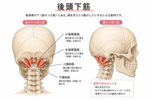 首の後ろ、頭の付け根あたりに後頭下筋(こうとうかきん)という小さな筋肉があります。